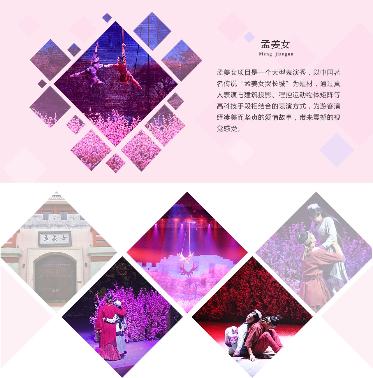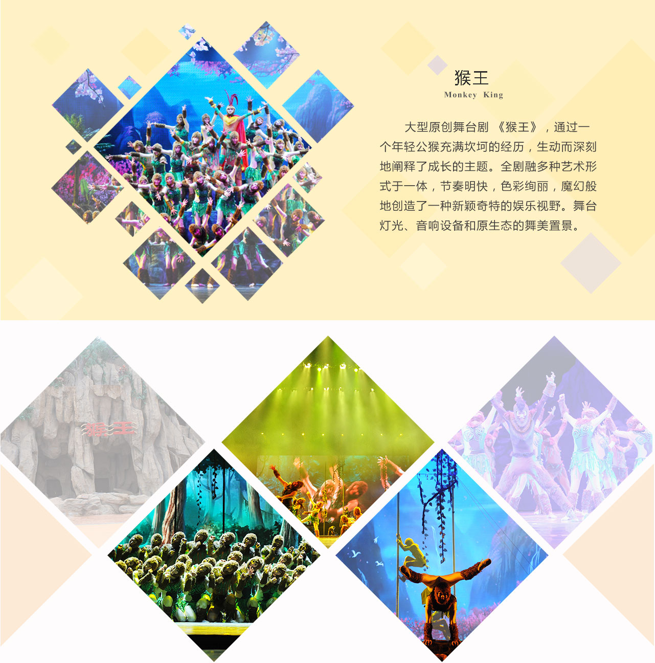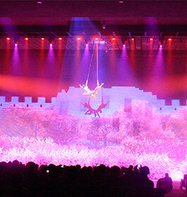 華強方特借助在自動控制、人工智能、機械設備、影視特技等方面的優勢,成功打造"猴王"、"飛翔之歌"、"孟姜女"等多個令人嘆為觀止的主題演藝項目,以現代高科技表現手段為核心,集合現代音樂、舞蹈、雜技、武術、戲劇、多媒體等多種藝術要素于一體,呈現氣勢磅礴,美輪美奐的舞臺效果。其中,大型程控矩陣真人舞臺表演項目《孟姜女》榮獲2015 IAAPA"銅環獎"特別頒發的最震撼人心獎,大型演藝項目《猴王》摘得2014 IAAPA"銅環獎"最佳現場演出獎,演藝劇目《在馬戲團的日子》獲得第八屆中國舞蹈"荷花獎"當代舞表演銀獎。