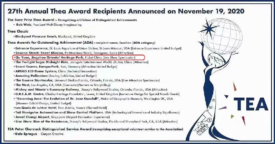 美國當?shù)貢r間11月19日,國際主題娛樂協(xié)會(TEA)公布了第 27 屆 Thea 大獎名單,華強方特集團旗下荊州方特東方神畫主題樂園的大型真人演藝特效劇場項目——《屈原》榮獲2020年度“杰出成就獎”。