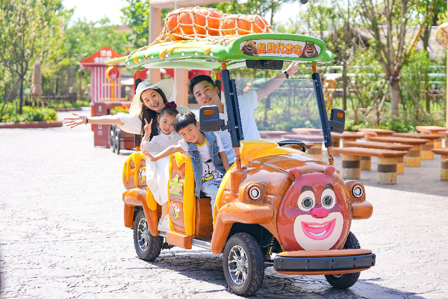 在旋轉環境4D劇場項目《熊出沒之重返侏羅紀》,游客們乘坐旋轉平臺,跟隨熊大、熊二、光頭強“穿越”回侏羅紀時代的趣味情節引起了親子家庭的共鳴。自貢當地游客黃先生說:“這個項目不僅僅是小孩喜歡的熊出沒主題,且畫面唯美,情節感人,也非常適合全家人一起體驗。”