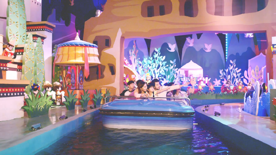 同樣是以成語為主題,大型室內(nèi)漂流項目《成語童話》則讓家長和孩子在室內(nèi)河道漫游童話般的成語王國,美輪美奐的成語布景、萌趣可愛的成語主角,讓游客們嘖嘖稱奇,紛紛拿出手機記錄下這夢幻般的場景。