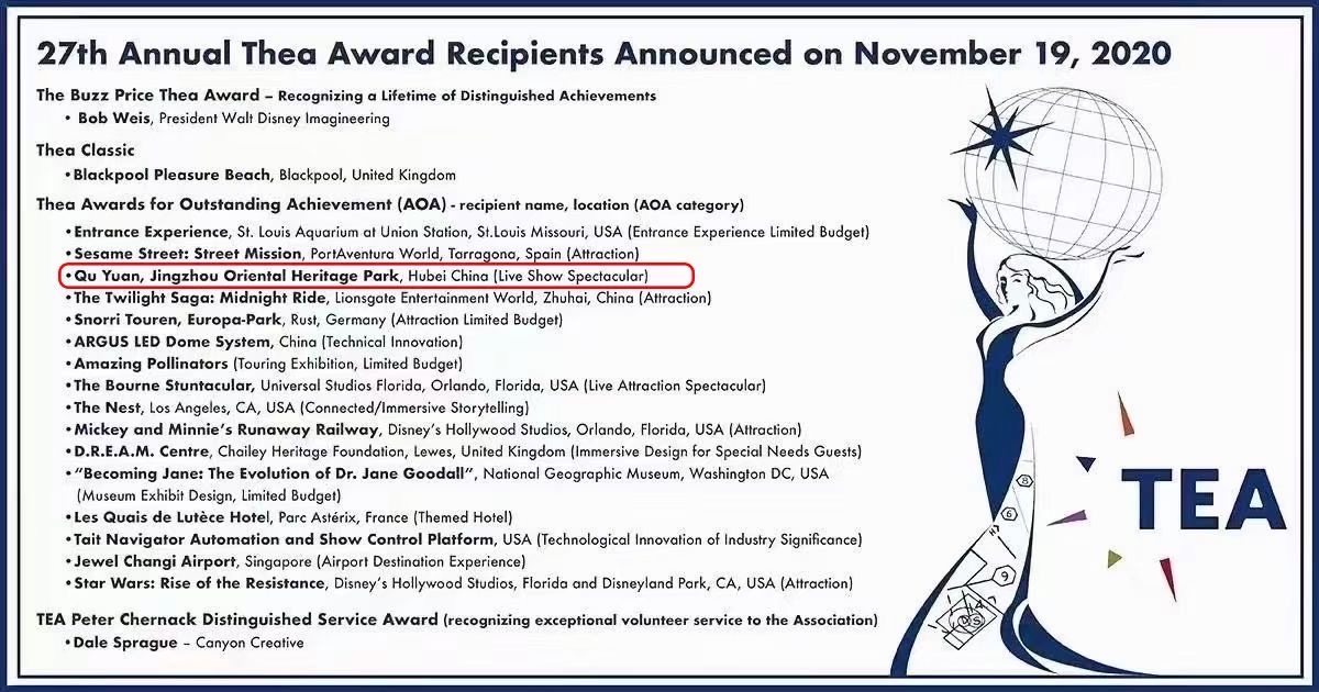 美國當?shù)貢r間11月19日,國際主題娛樂協(xié)會(TEA)公布了第27屆Thea大獎名單,華強方特集團旗下荊州方特東方神畫主題樂園的大型真人演藝特效劇場項目——《屈原》榮獲2020年度“杰出成就獎”。據(jù)悉,成立于1991年的主題娛樂協(xié)會(ThemedEntertainmentAssociation:TEA)作..