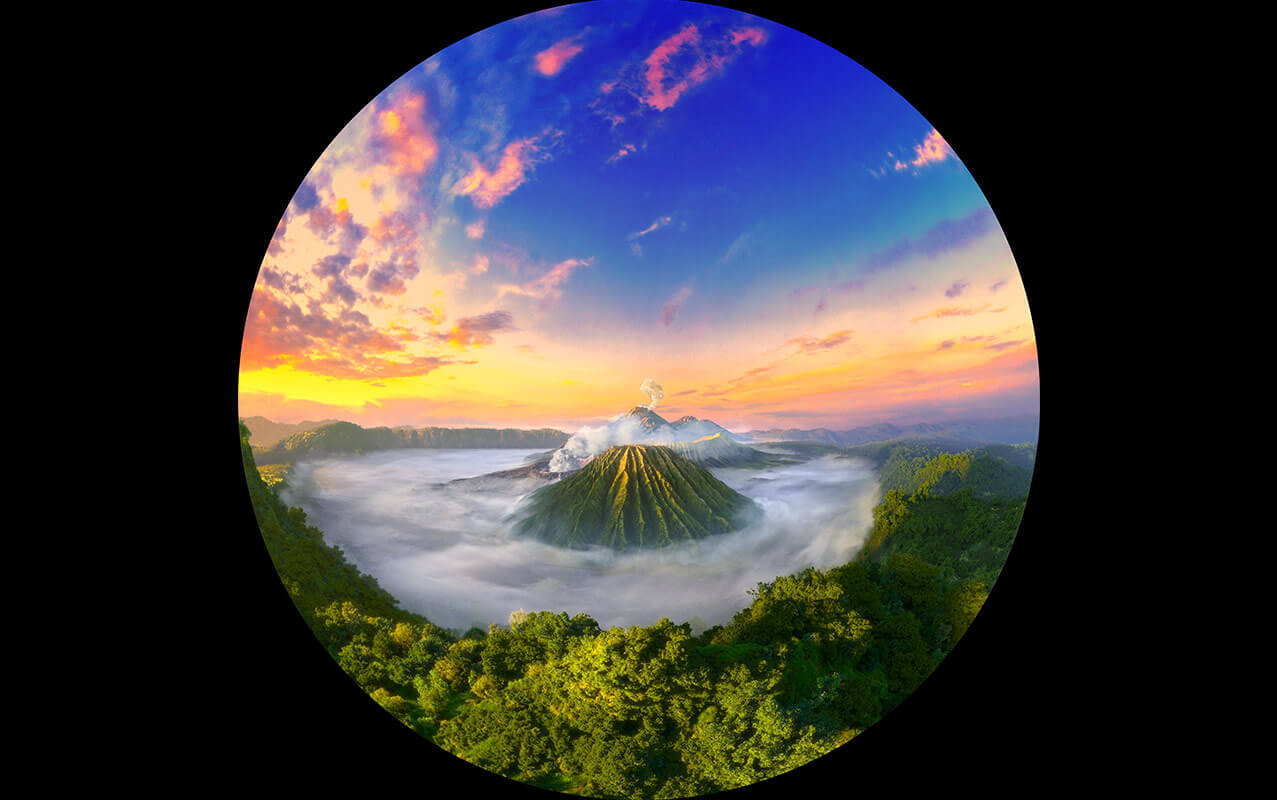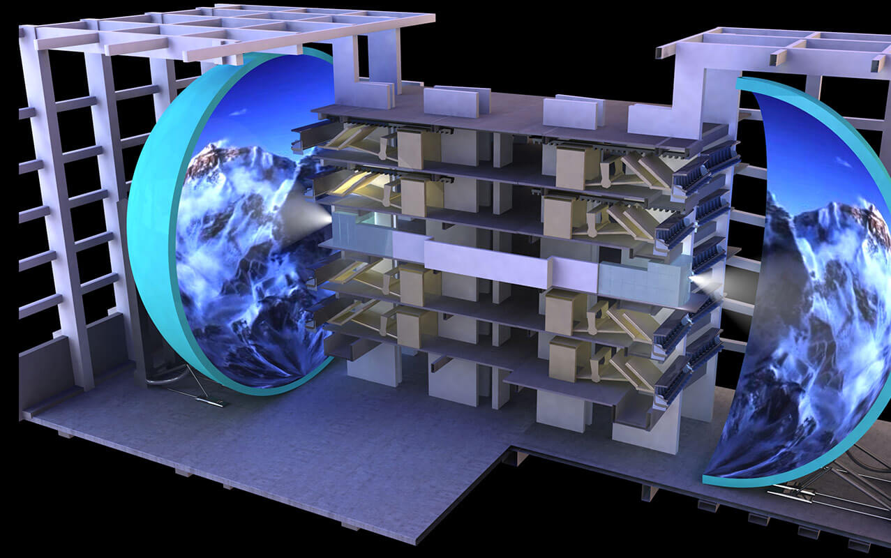 球幕投影系統包含高清晰度球幕設計、高清晰度投影系統設計以及大張角魚眼鏡頭設計等幾部分。球幕影院屏幕呈半球形,游客被包圍其中,給游客無邊界,接近真實的視覺感受。結合懸掛式行模擬器座椅模擬影片鏡頭運動,為游客創造出良好的觀影效果。